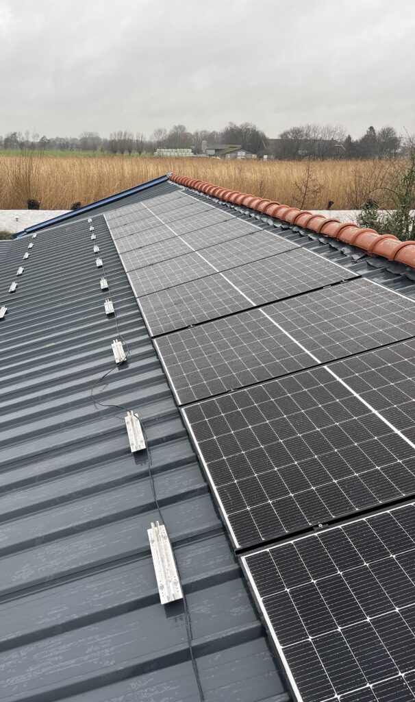 Hier hebben wij 28 panelen op het dak van de schuur mogen plaatsen. Het zijn zonnepanelen van Q Cells van 410wp per stuk. Met een accu-ready 10 kw omvormer van Huawei.